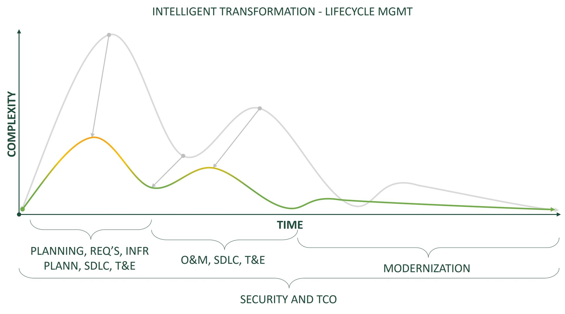 If you look at the two charts that accompany this section, you can actually see this story play out. The first curve shows the traditional digital transformation lifecycle, with its steep climb, second spike, and long tail of stabilization. The second curve overlays Intelligent Transformation on top of it and makes the contrast impossible to ignore. The shapes are familiar, but the behavior changes. The peaks flatten. The dips smooth out. The entire system becomes easier to manage.