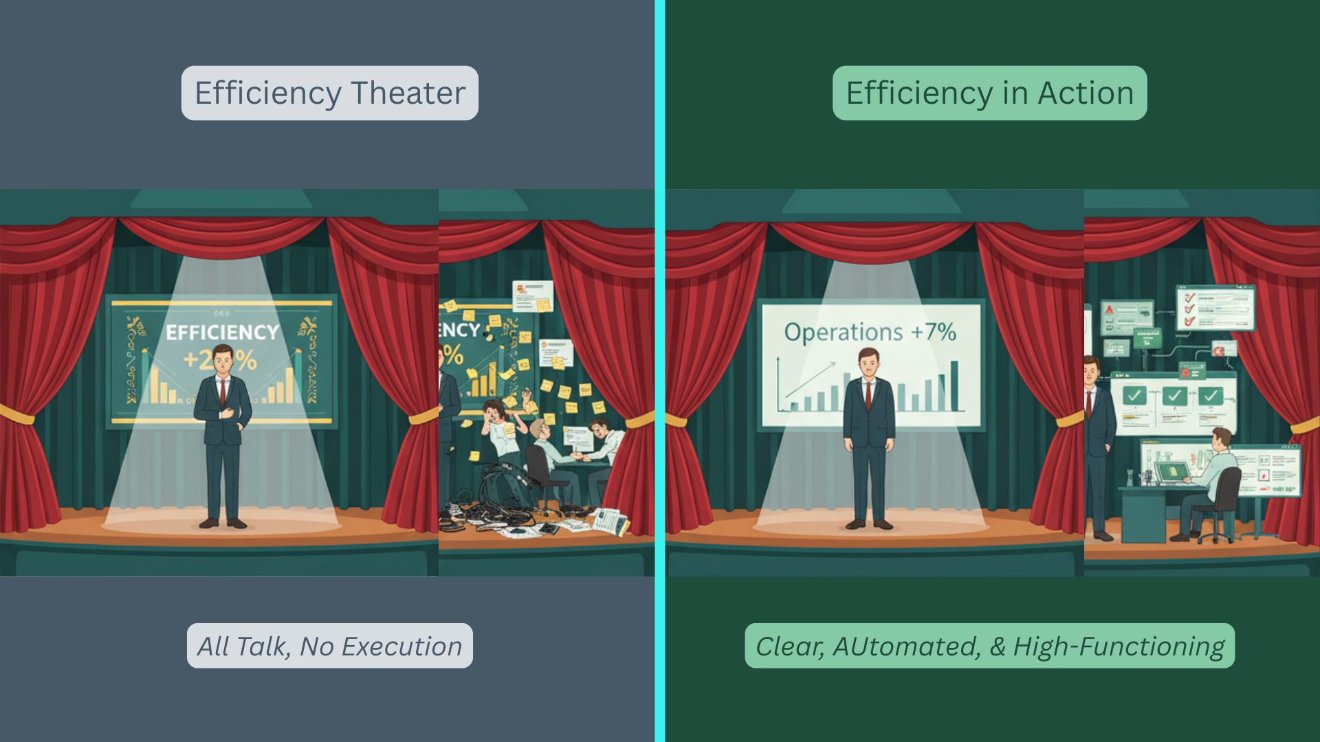 Image of efficiency theater compared efficiency in action (image by J Eselgroth with Gen AI)