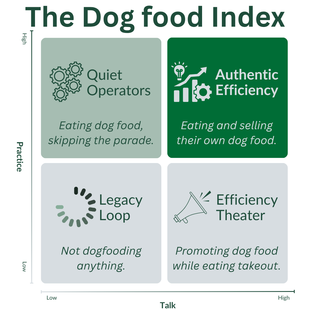 Picture a simple two-by-two grid. I call it the Dog food Index. One axis shows how loudly a team talks about efficiency. The other shows how deeply it practices it.